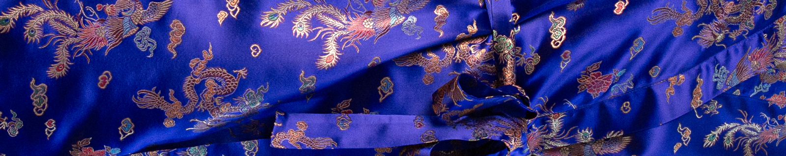 Az anyagokról: közepes vastagságú, fényes alapon színes, jacquard mintázatú kínai szatén választható színekben. A mintákat tekintve virágos, barokk vagy sárkányos.